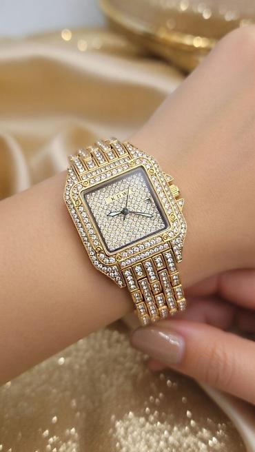 Gucci qadın qol saatı - Korpus: yumşaq kvadrat formalı, qızılı tonlu metal çərçivə, ön hissədə boz bezel. - Siferblat: gümüşü günəş şüası effektli, minimalistik 2 əqrəbli dizayn, “GUCCI” loqosu. -...