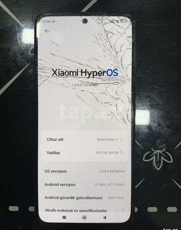 Göstərilən şəkillərdə cihazın ekranı və arxa panel görünür. HyperOS və təhlükəsizlik yeniləməsi 2024‑10‑01 tarixinə qədər quruludur. 6.43" AMOLED ekranlı Redmi Note 11 modelinin yüngül, gündəlik istifadə və multimedia üçün uyğun performansı, stereo dinamikləri və IR blasteri var.