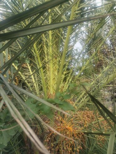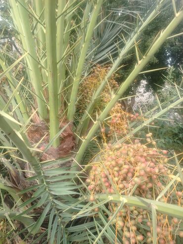 - Şəkillərdə tam məhsuldar xurma palmı görünür. Ağacın aşağı hissəsində iri salxımlarla çoxsaylı xurma meyvələri formalaşıb.