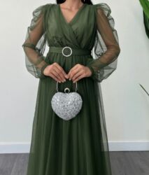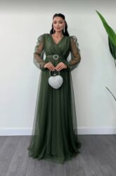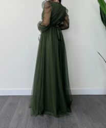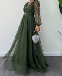 Çox zərif və eleqant uzun ziyafət paltarı satılır. Rəngi yaşıl, materialı tül və atlas qatlıdır. Qolu tül, beli isə daşlı kemerli. Kemerli ve kemersiz istifadə oluna bilər.Cəmi bir dəfə geyinilib, tam ideal vəziyyətdədir – ləkə, cırıq, defekt yoxdur.