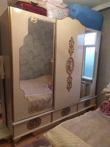 - Geniş 3 qapılı şkaf: iki sürgülü güzgülü bölmə, alt hissədə dekorativ plintus və bəzək elementləri