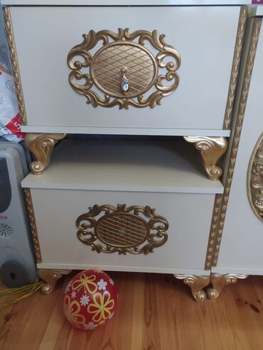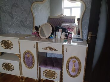 - Makiyaj masası: böyük dalğalı güzgü, çoxsaylı şkaf və çekmecələr, ortada oturacaq yeri və yumşaq balış