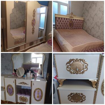 - Döşəklə birlikdə iki‑nəfərlik çarpayı: hündür, düyməli (kapitone) başlıq, qızılı ornament, orta hissədə medalion