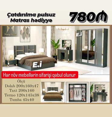 Yataq dəsti – 4 parçalı komplekt – Dolab: 200×160×47 – Taxt: 200×160 – Termo (makiyaj masasI): 120×145×38 – Tumba: 45×40 Xüsusiyyətlər: - Matras daxildir/hediyyə qeyd olunur - Şəhər içi çatdırılma...