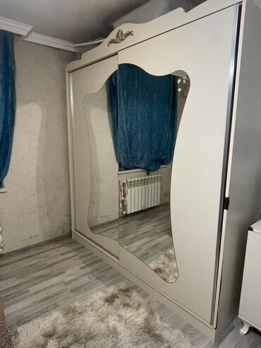 • 3 qapılı kupe-dolab – iri güzgülü sürgülü qapı, dalğalı konturlu dekor, daxildə asılqan və rəf bölmələri