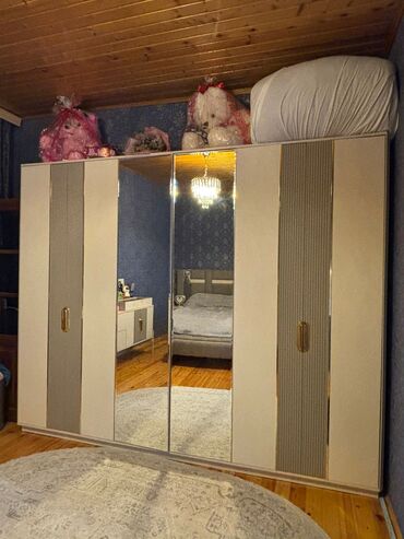 - 5 qapılı dolab: orta hissə güzgülü, yan hissələr zolaqlı dekor və qızılı tutacaqlar