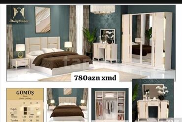 Yataq otağı dəsti - Çarpayı ölçüsü: 1.60 x 2 m - Dolab ölçüsü: 2 x 1.60 / 47 - Rəng: boz tonlarda, qızılı dekor xətləri - Komplekt: çarpayı, iki tumbə, 4 qapılı güzgülü şkaf, böyük güzgülü kosmeti...