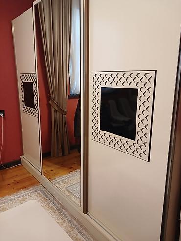 - 3 qapılı kupe dolab: sürgülü qapılar, bir qapıda tam boy güzgü, digərində dekorativ oyma panel və tünd şüşə inlay; geniş saxlanma üçün uyğundur.
