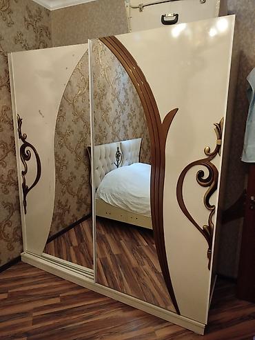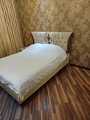 Yataq otağı mebel dəsti - Yataq: Yumşaq, hündür süngərlə kapitonaj başlıq, krem rəngli döşəmə çərçivəsi. Standart ikinəfərlik ölçü (şəklin ölçüsünə uyğun). Dekorativ yastıqlar və örtü foto üçün gö...