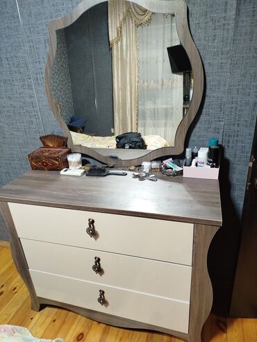 - Komod və güzgü: 3 çekmecəli komod, üst tabla və yan tərəflər tünd ağac rəngində, ön panellər krem; dekorativ metal tutacaqlar. Üstündə iri dekorativ çərçivəli güzgü.