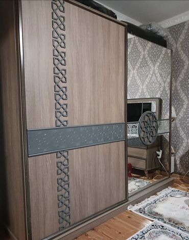 - Güzgülü paltar şkafı: sürgülü qapılar, taxta teksturalı səth, boz dekor zolaqları və həndəsi naxış elementləri; bir qapı tam güzgülü.