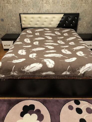 - Yataq: iki nəfərlik, qara-ağ rəngdə. Başlıqda yumşaq dəri/parça üzlü hissə, dekorativ düyməciklərlə. Yanlarda uyğun tumbi (2 ədəd), çekmecəli, dalğalı metal tutacaqlarla.