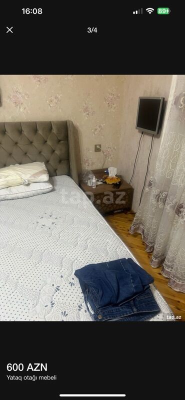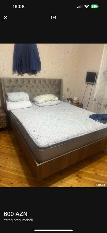 - İki nəfərlik çarpayı: taxta əsas, yumşaq başlıq (kapitone tikişli), ortopedik döşək üzərində