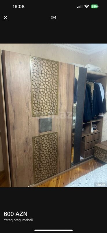 - 2 sürgülü qapılı, güzgülü böyük şkaf: taxta teksturalı korpus, dekorativ hörgü naxışlı panellər, içəridə asılqan bölməsi, rəflər və çekmecələr