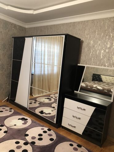 - Geniş sürgülü qapılı şkaf: üç qapı, mərkəzdə iri güzgü panelləri; yanlarda qara-ağ kontrast panellər. Geyim üçün asılqan və rəf saxlama imkanı.