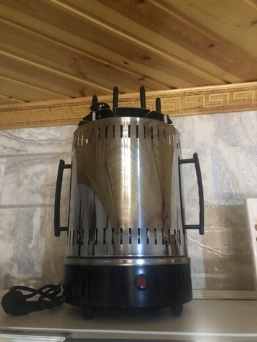 - Elektrikli şiş kabab aparatı: silindrik paslanmayan polad korpus, iki yanda istiliyədavamlı tutacaqlar, alt hissədə açma/söndürmə düyməsi. Üst hissədə bir neçə şiş üçün yerlər; 220V şəbəkə ilə işləyir. Ev şəraitində şiş kabab və dönər tipli qızartmalar üçün uyğundur, damcı qabı və bərabər bişirmə üçün dövrəvi istilik.