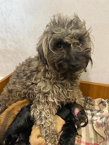Yavrulu it – balalar - Ana it qıvrım tüklü, orta ölçülü, ev