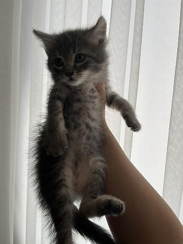İlan: Gözəl balaca pişik balası - Cins: (fotoqrafiyaya əsasən) qıvrıq qulaqlı/yuvarlaq başlı şirin balaca pişik - Rəng: gümüşü-boz tabby (xallı/zolaqlı), qarın hissəsi açıq rəng - Gözlər: iri, mav...