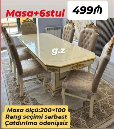 - Komplekt: 1 masa və 6 ədəd bel hissəsi qapitonlu, oyma dekorlu stul