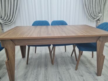Masa və stul dəsti - Dəst: düzbucaqlı ağac naxışlı masa + mavi məxməri oturacaqlı stullar - Stullar: yüksək arxalı, düyməli (kapitone) dizayn, yumşaq oturacaq, ağac ayaqlar - Masa: möhkəm konstruk...