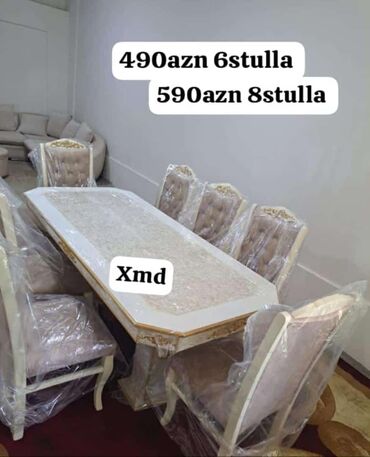 - Dizayn: Açar kənarlı, qızılı naxışlı dekor, klassik ağ-krem tonlarında masa; yumşaq oturacaqlı, bel hissəsi tuftinq işləməli stullar.