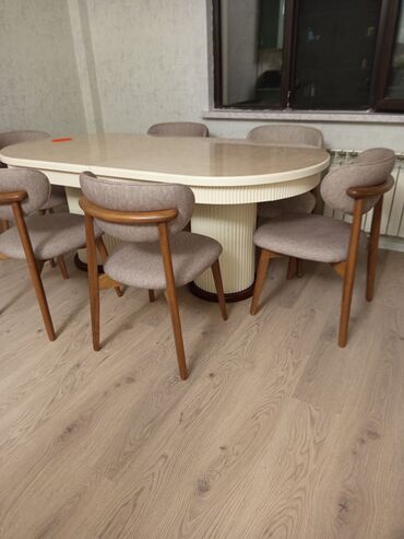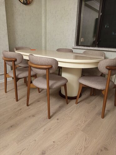 Dəst: 1 ədəd oval masa + 6 ədəd yumşaq oturacaqlı stul.