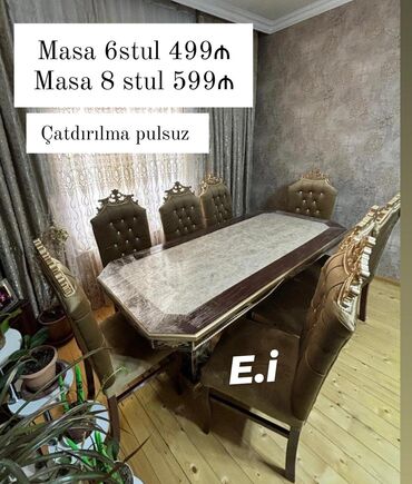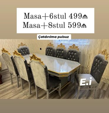 Müasir klassik dizaynlı yemək otağı dəsti - Dəstlər: - Masa + 6 stul – 499₼ - Masa + 8 stul – 599₼ - Şəhər daxili çatdırılma pulsuz Xüsusiyyətlər: - Zərif qızılı ornamentlərlə işlənmiş, mərm...