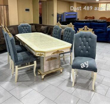 - Rəng: krem-ağ masa, qızılı naxış və detallar; stullar boz/boz-mavi məxmər parça ilə