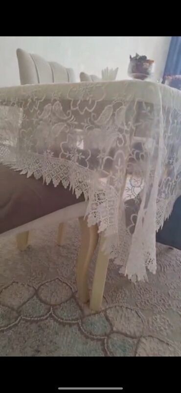 - Masa: Düzbucaqlı forma, krem rəngli, klassik üslub. Üstündə zərif naxışlı masa örtüyü və üzərini qoruyan şəffaf, krujeva haşiyəli örtük var. Stabil taxta ayaqlar.