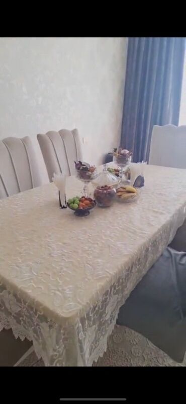 - Oturacaqlar: 6 ədəd yumşaq parça ilə üzlənmiş, yüksək bel dayaqı olan stullar. Krem-bej tonlarda, masaya uyğun dizayn.