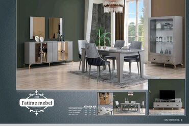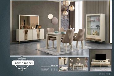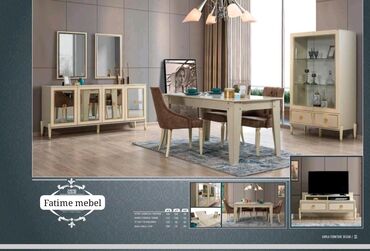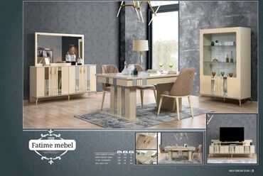 - Komplekt tərkibi: vitrin (şüşəli dolab), konsol və güzgü, TV tumbası, masa və stullar.