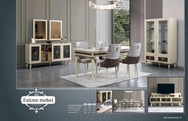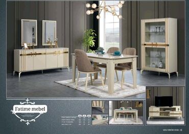 - Masa: geniş üstlük, uzadıla bilən mexanizmli model variantları; yumşaq oturacaq və arxalığa malik komfortlu stullar.
