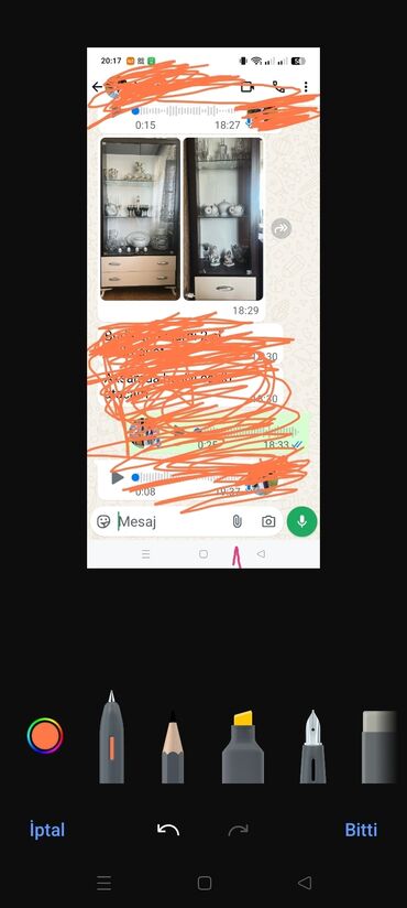 - Sağ tərəfdə ayrıca şkaf-vitrin (ikinci fotoda görünür): üst rəflərdə çay/qəhvə servis elementi və şüşə qədəhlər, alt hissədə geniş çekmece.