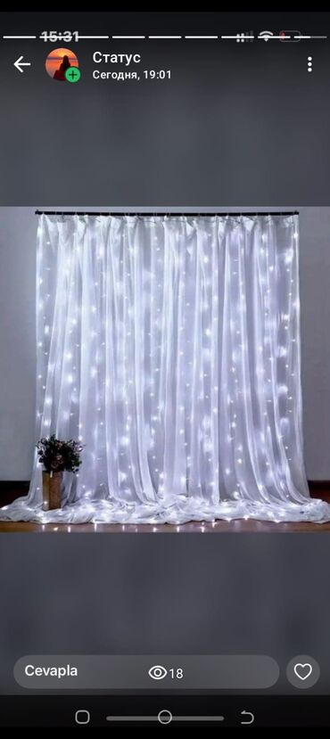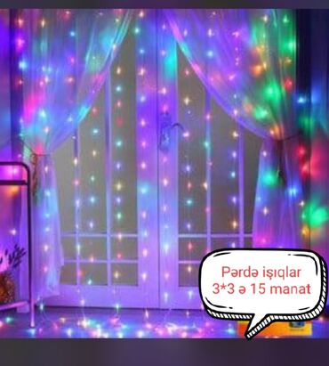 - Pərdə işıqları: 3x3 m ölçü, isti-ağ və rəngbərəng variantlar. Nazik şeffaf şnur, pərdə karnizinə asmaq üçün uyğun. Xırda LED işıqlar bərabər paylanır, fon və fotozona yaratmaq üçün ideal.