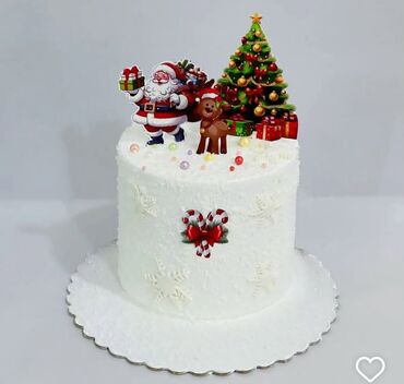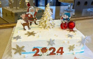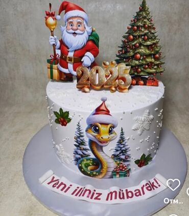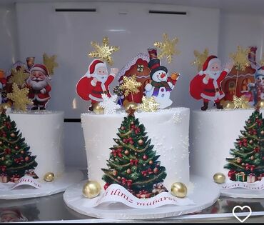- Rəng və üslub: ağ qar effekti ilə örtük, qızılı və rəngli bəzəklər; üst hissədə tematik toppers və yeməli şəkillər.