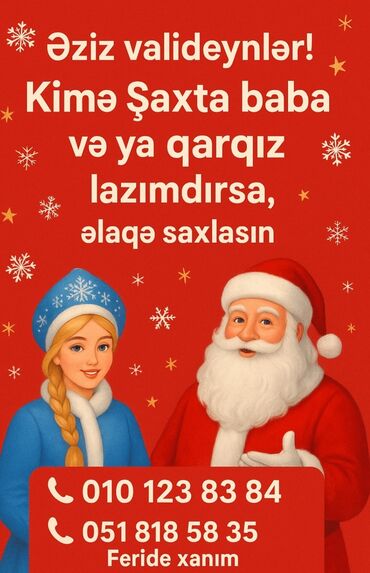 Qeyd: Elandakı vizualda göstərildiyi kimi “Kimi Şaxta baba və ya qarqız lazımdırsa, əlaqə saxlasın” məlumatı mövcuddur. Bu xidmət ailəvi bayramlar, uşaq doğum günləri, məktəb və bağça şənlikləri üçün uyğundur.