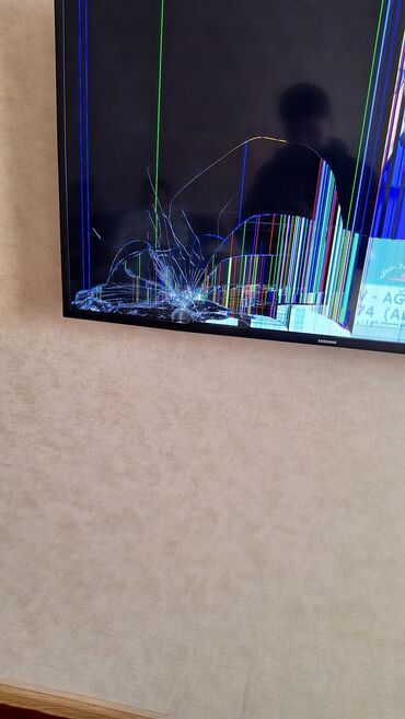 - Ekranda çatlar və şaquli xətlər görünür, görüntü hissəvi pozulub.