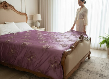 Yun yorğanlar - Material: təbii yun doldurmalı, ənənəvi əl tikməli yorğanlar. - Parça: üstü zərif naxışlı parça (sarı-qızılı tonlarda), digər tərəfi çiçək naxışlı/parça kombinasiyalı. Kənar bəzəkl...