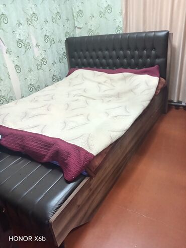 İki nəfərlik yataq dəsti - Ölçü: təxminən 140–160 sm en (şəkillərdən göründüyü kimi iki nəfərlik). - Komplekt: karkas/çarpayı, əldəki döşək, üstündən örtük. - Karkas: tünd qəhvəyi rəngdə, dekorati...