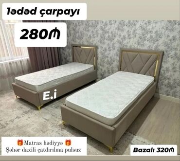 Tək nəfərlik çarpayılar - Model: Yumşaq başlıqlı, qızılı dekor detallı modern dizayn - Seçimlər: - Sadə çarpayı – 280₼ - Bazalı (yüklük qutulu) – 320₼ - Rənglər: Tünd lacivərt və bej - Komple...