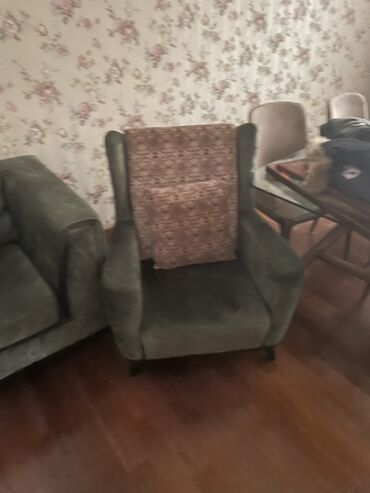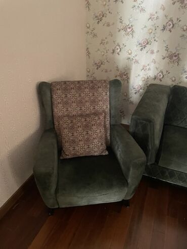 Yaşıl rəngli yumşaq dəst – 2 ədəd geniş kreslo və çevrilən/divan - Material: məxməri toxunuşlu yumşaq parça, dolğun süngər oturacaq və bel hissəsi - Rəng: zeytun-yaşıl, ağac ayaqlar - Dizayn: enli,...