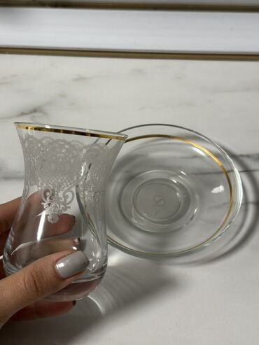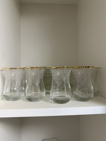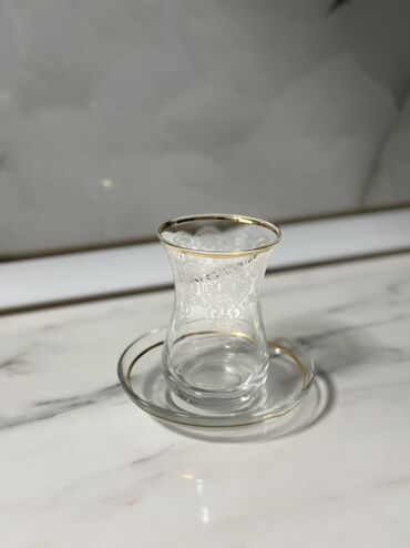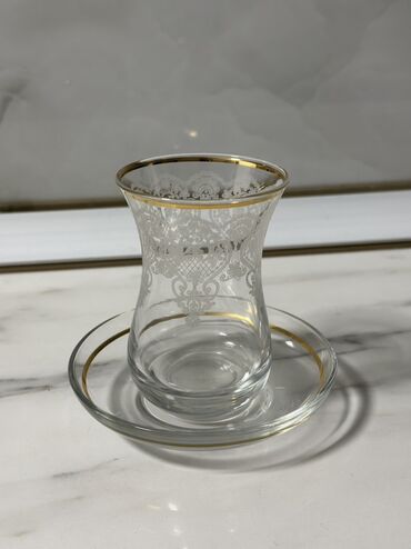 Şüşə çay stəkanları dəsti - 6 ədəd armudu formalı şüşə stəkan - Qızılı rəngli əsas/soket hissəsi ilə dekorativ dizayn - Dəstlə birlikdə uyğun ölçülü boşqabcıq/nəlbəkilər də var (qızılı haşiyəli) -...