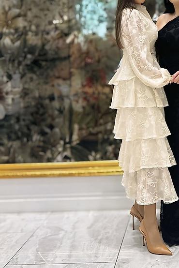 Zərif ziyafət geyimi, bej rəng, bel hissəsi rezinli. Kəmərli.