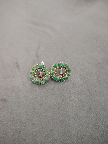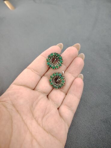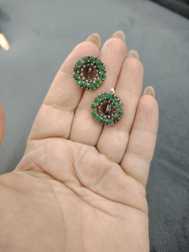 - Qadınlar üçün 2 cüt sırğa dəsti 1) Dairəvi dizaynlı, tünd yaşıl-qara rəngli parlaq daş mərkəzli klipsli sırğalar. Metallik gümüşü halqa üzərində daşın yarımay hissəsini incə şəffaf bəzək daşları ...