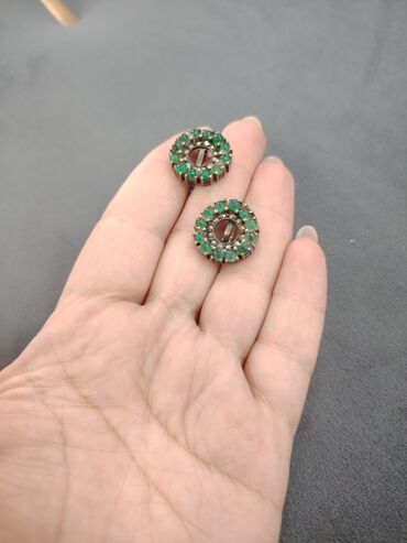 EndirimsizZümrüd rəngli daşlarla bəzədilmiş gümüş dairəvi sırğa cütü