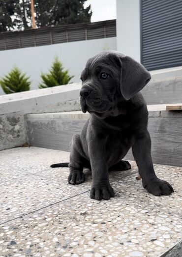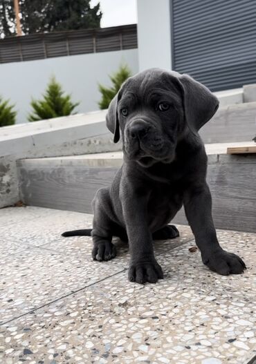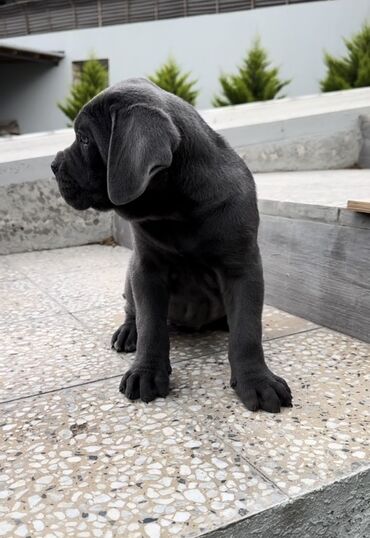 Boz və qara rəngli Cane Corso balaları. Bu it cinsi öz sədaqəti və güclü xarakteri ilə tanınır. Evinizi və ailənizi qorumaq üçün əla seçim ola bilər. 45 günlükdürlər hal hazırda. Safqan, sağlam, iri sümüklü və gələcəkdə ağır çəkili, böyük heyvan arzulayanlar buyursun. Qurd dermanlari verilib, peyvendleri vurulub, qulaq ve quyruqlari kesilib.
