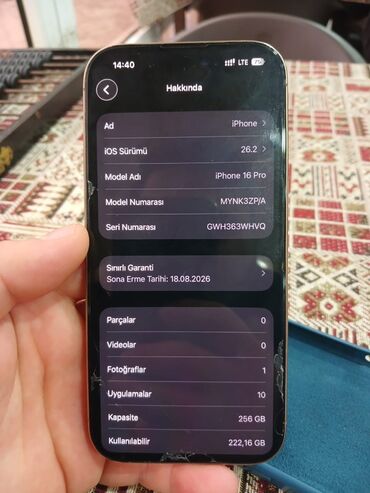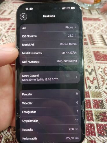 Apple iPhone 16 Pro – 256 GB Məlumat: - Model: iPhone 16 Pro - Model nömrəsi: MYN23AH/A - Rəng: Açıq qızılı/bej ton - Yaddaş: 256 GB (236,51 GB istifadə oluna bilən) - iOS versiyası: 26.1 - Batare...