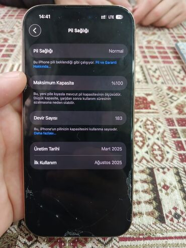 Apple iPhone (Pro seriyası) - Korpus: Desert Titanium - Ekran: Dynamic Island kəsiyi olan tam ekran panel - Kamera: üç ədəd arxa kamera və LED işıq - Batareya: Battery Health – Normal; Maksimum t...