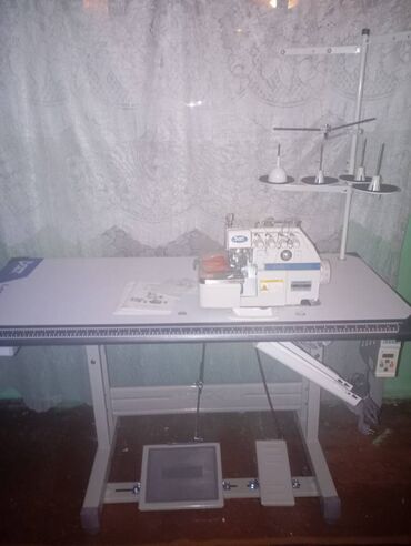 - Sənaye overlok maşını – 3/4/5 iplikli işləməyə uyğun quruluş (iplik stendləri, bıçaq bloku və diferensial ötürmə mexanizmi görünür). Təmiz kənar və elastik parçalar üçün overlok tikişi. Ayrı iş masası, iki pedal və idarə paneli.
