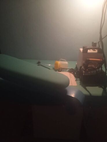- İki iynəli/saplı xüsusi tikiş maşını (yarı silindr qol tipli başlıq) – qalınlaşmış tikişlər, bəzək və ya birləşdirmə əməliyyatları üçün. Masada iplik stendi və pedal mexanizmi var.